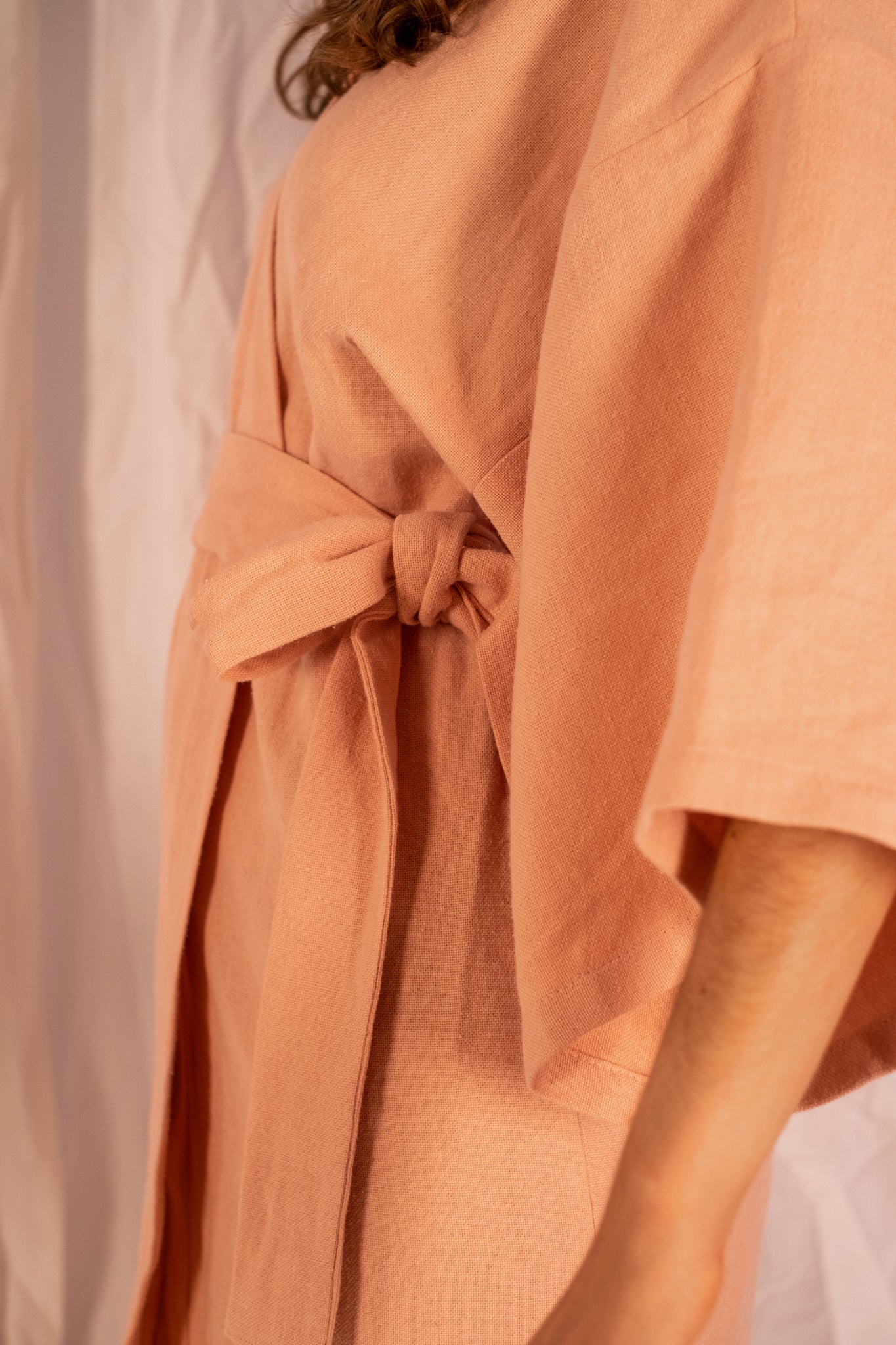 The Kimono is made of 100% natural and sustainable organic linen. For optimal care, I recommend cold hand wash or cold gentle machine wash. Do not use bleach or harsh chemicals and hang to air dry.