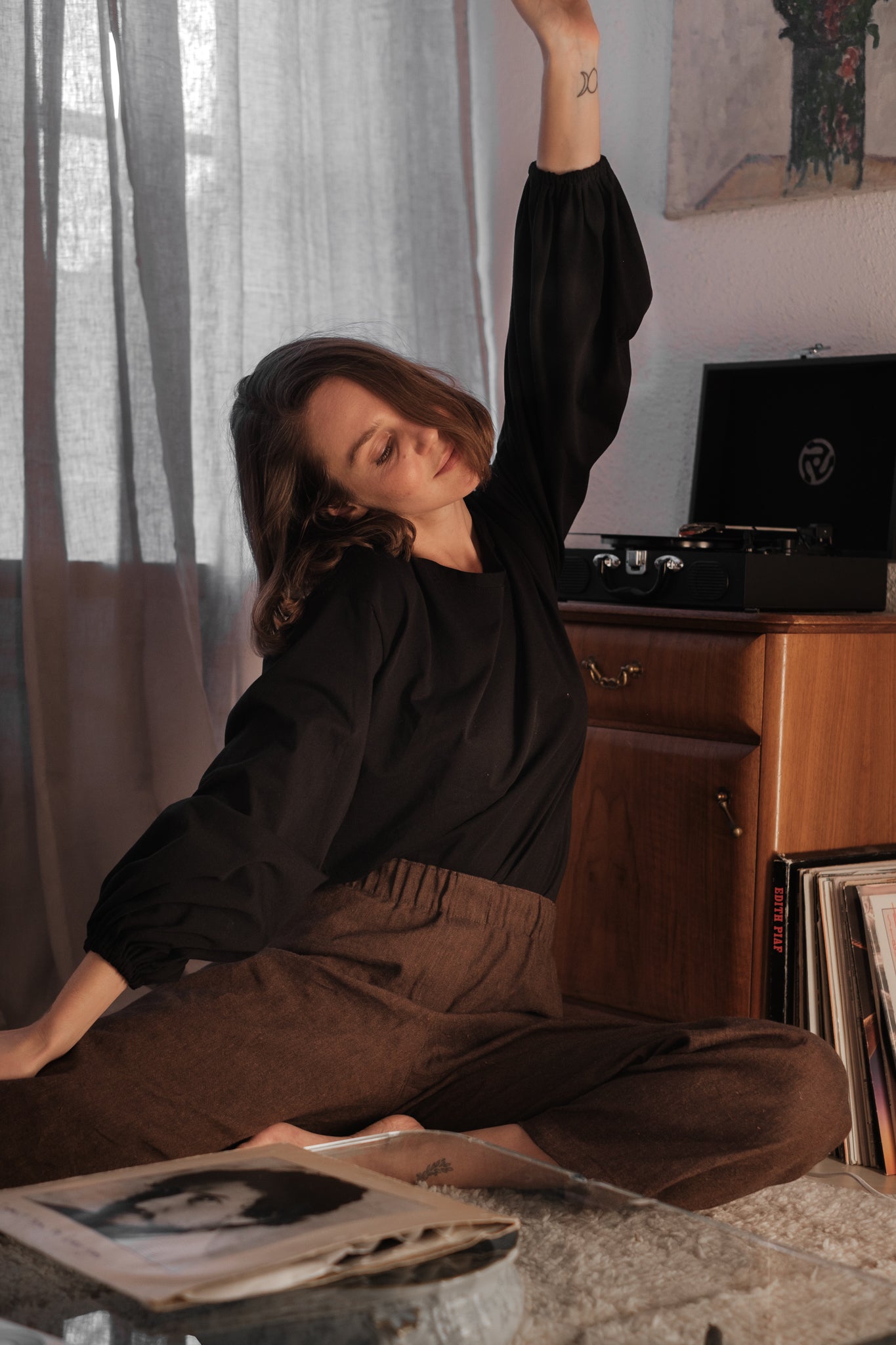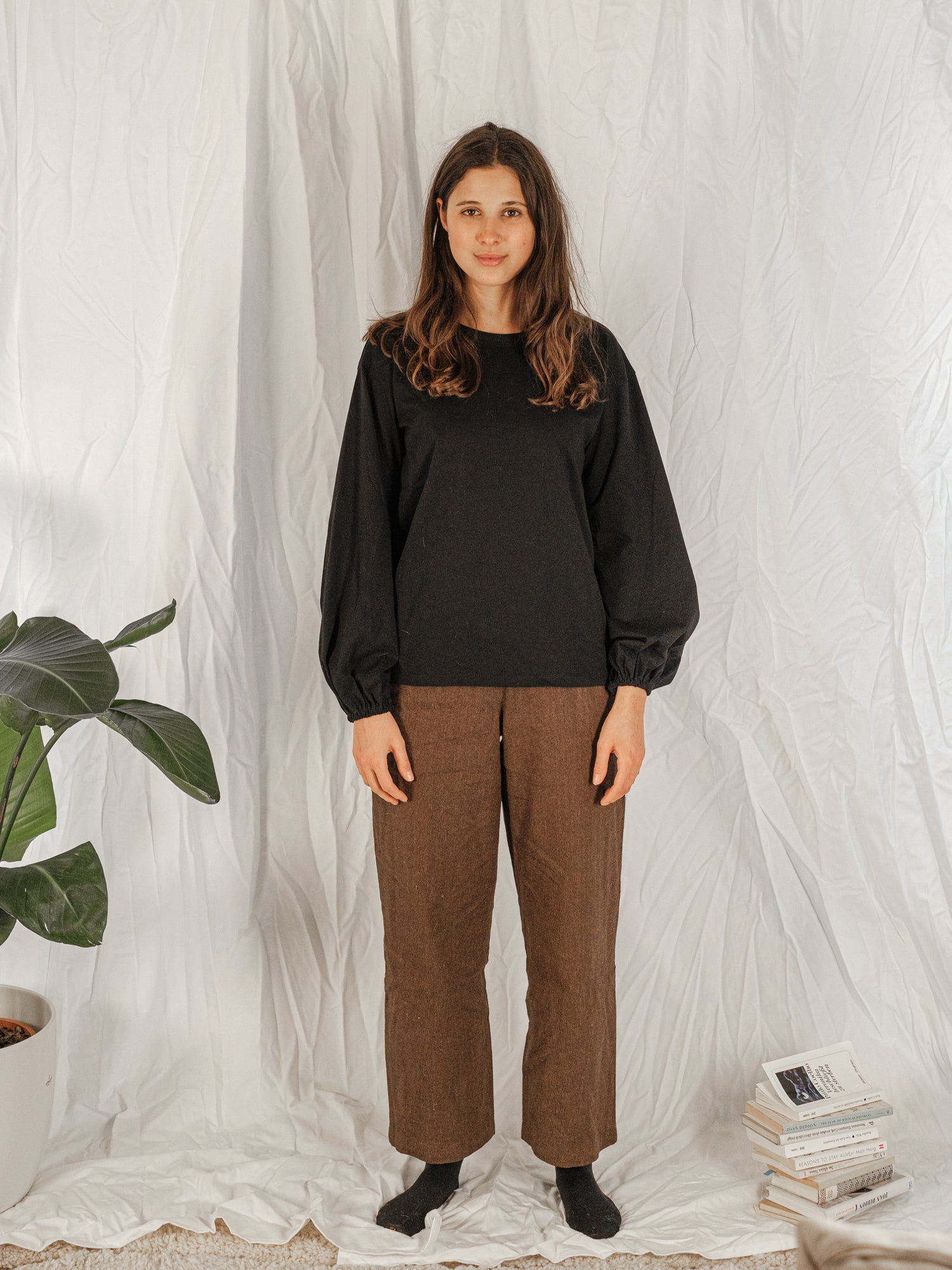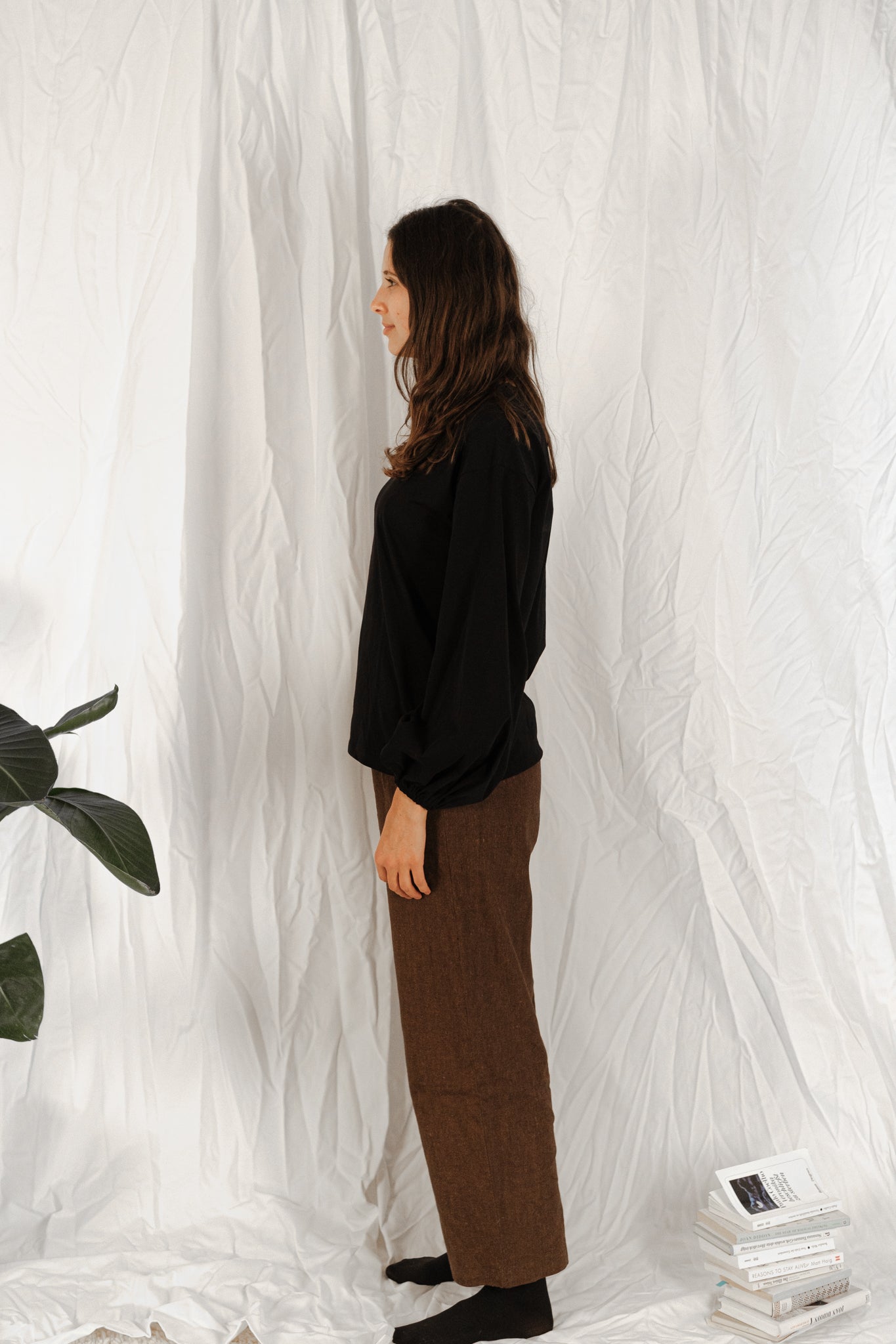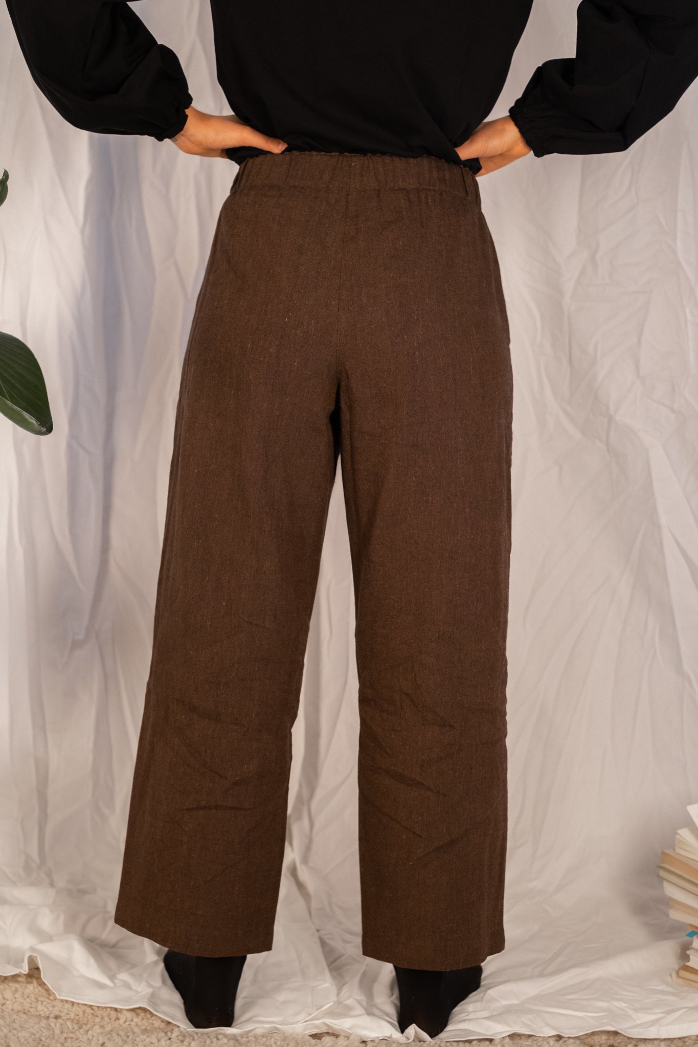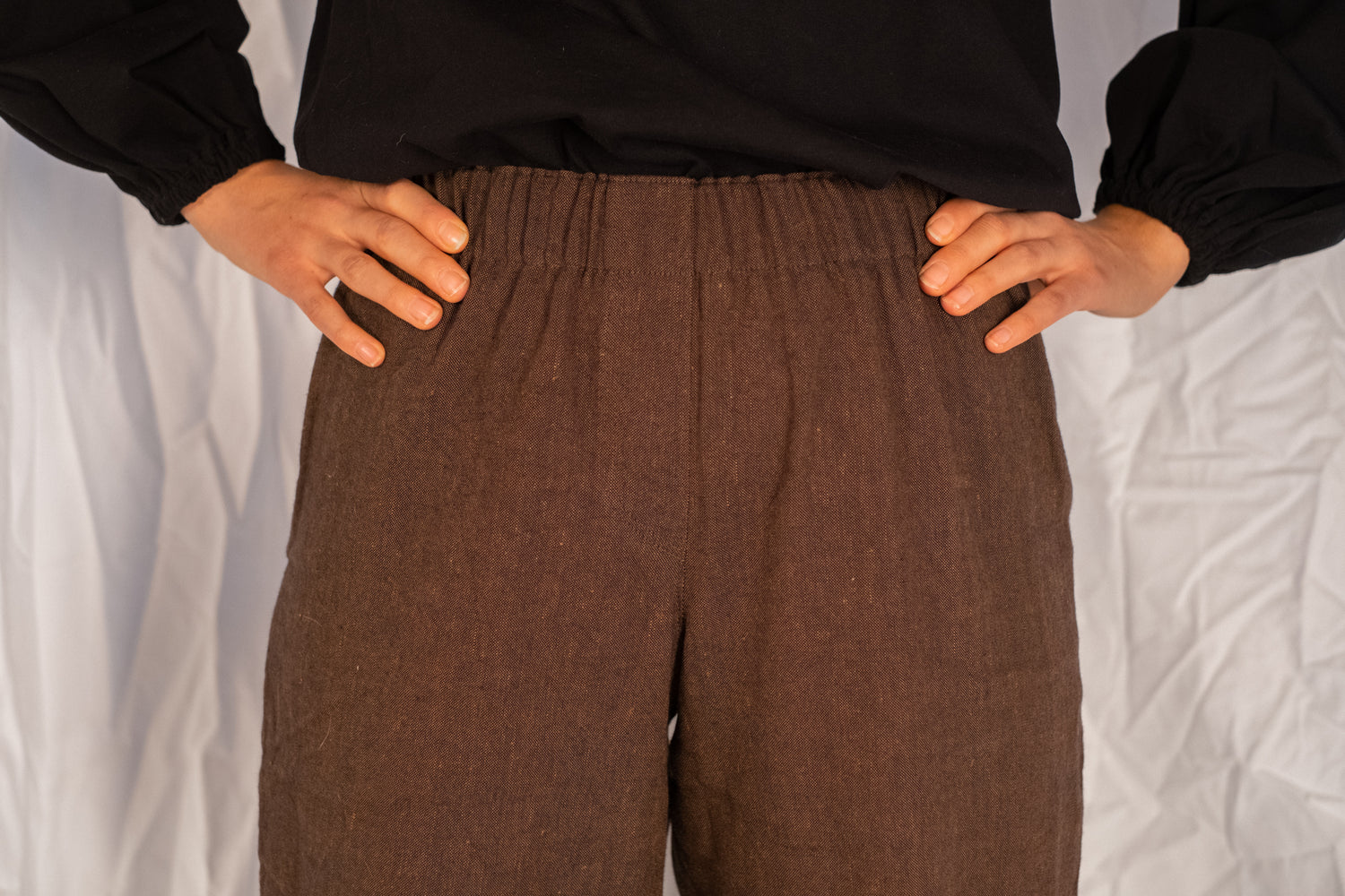 This dark brown high waist pant out of 50% linen and 50% hemp is a good companion at home, at work or wherever you want to take them.
