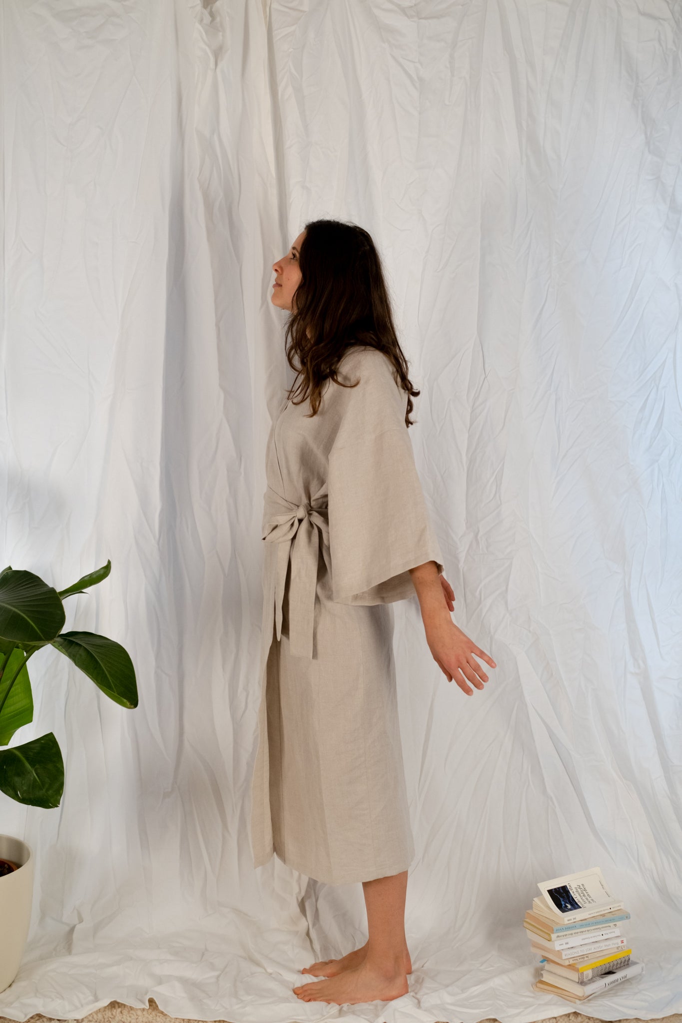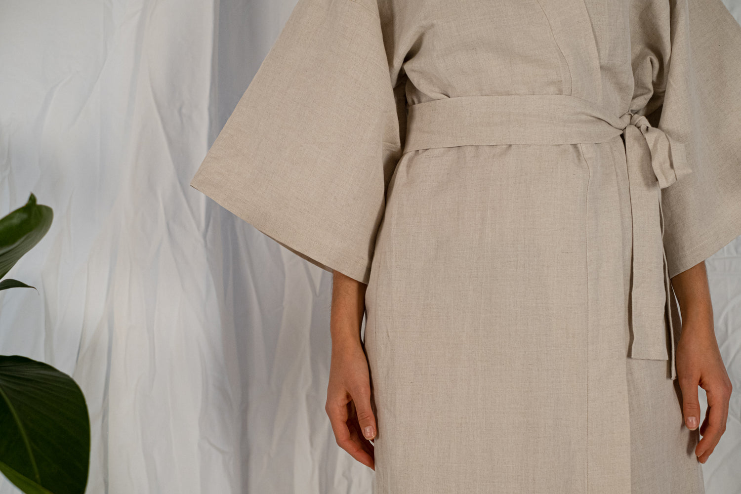 The Kimono is made of 100% natural and sustainable organic linen. For optimal care, I recommend cold hand wash or cold gentle machine wash. Do not use bleach or harsh chemicals and hang to air dry.