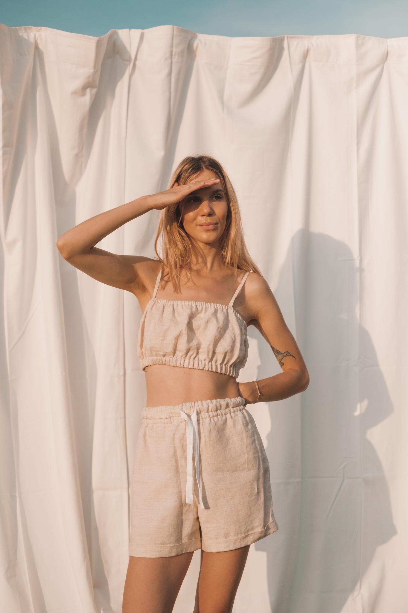 The Brigitte Crop-Top is a nostalgic piece, inspired by 60ies muses like Brigitte Bardot, Jane Birkin or Jane Fonda. A summer essential for your wardrobe and a perfect companion for strolling along the beach promenade.