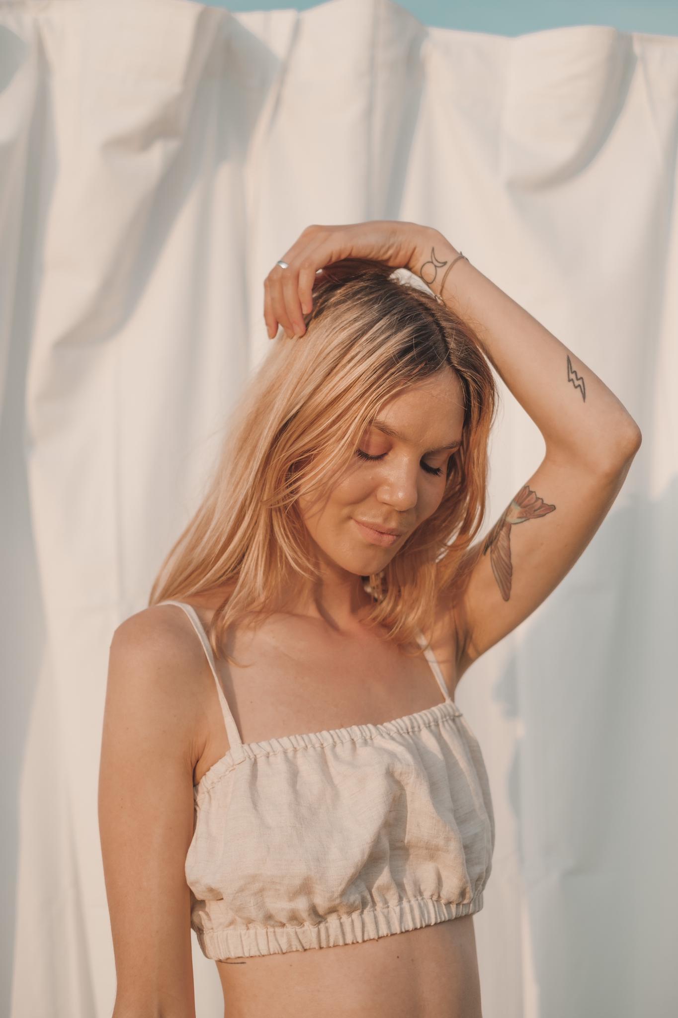 The Brigitte Crop-Top is made of 100% natural and sustainable fabric. For optimal care, I recommend cold hand wash or cold gentle machine wash (30°C). Do not use bleach or harsh chemicals and hang to air dry.