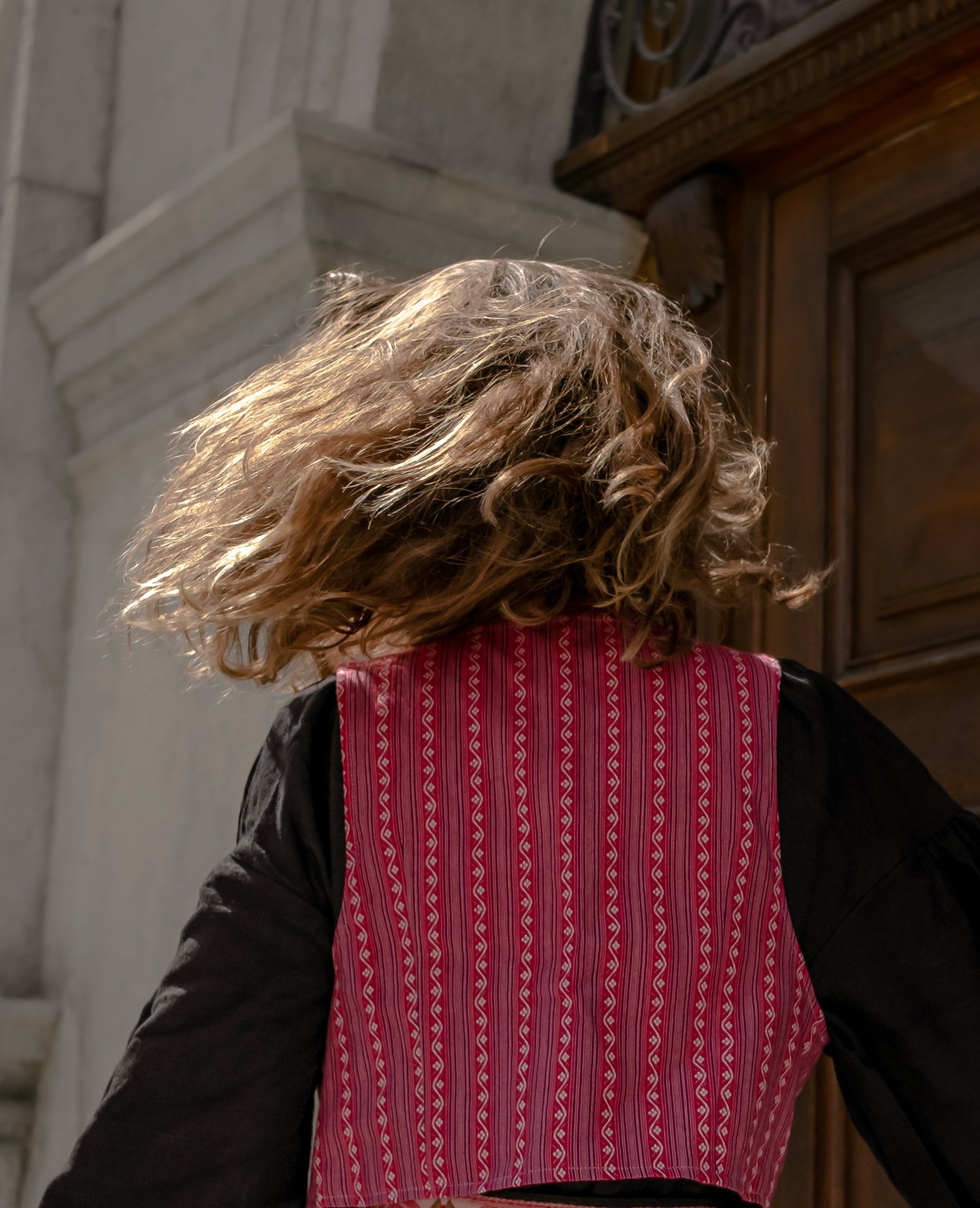 You can wear the gilet over one of our dresses, which gives it an even more folkloric touch, or you can wear it over any preowned clothing of yours.