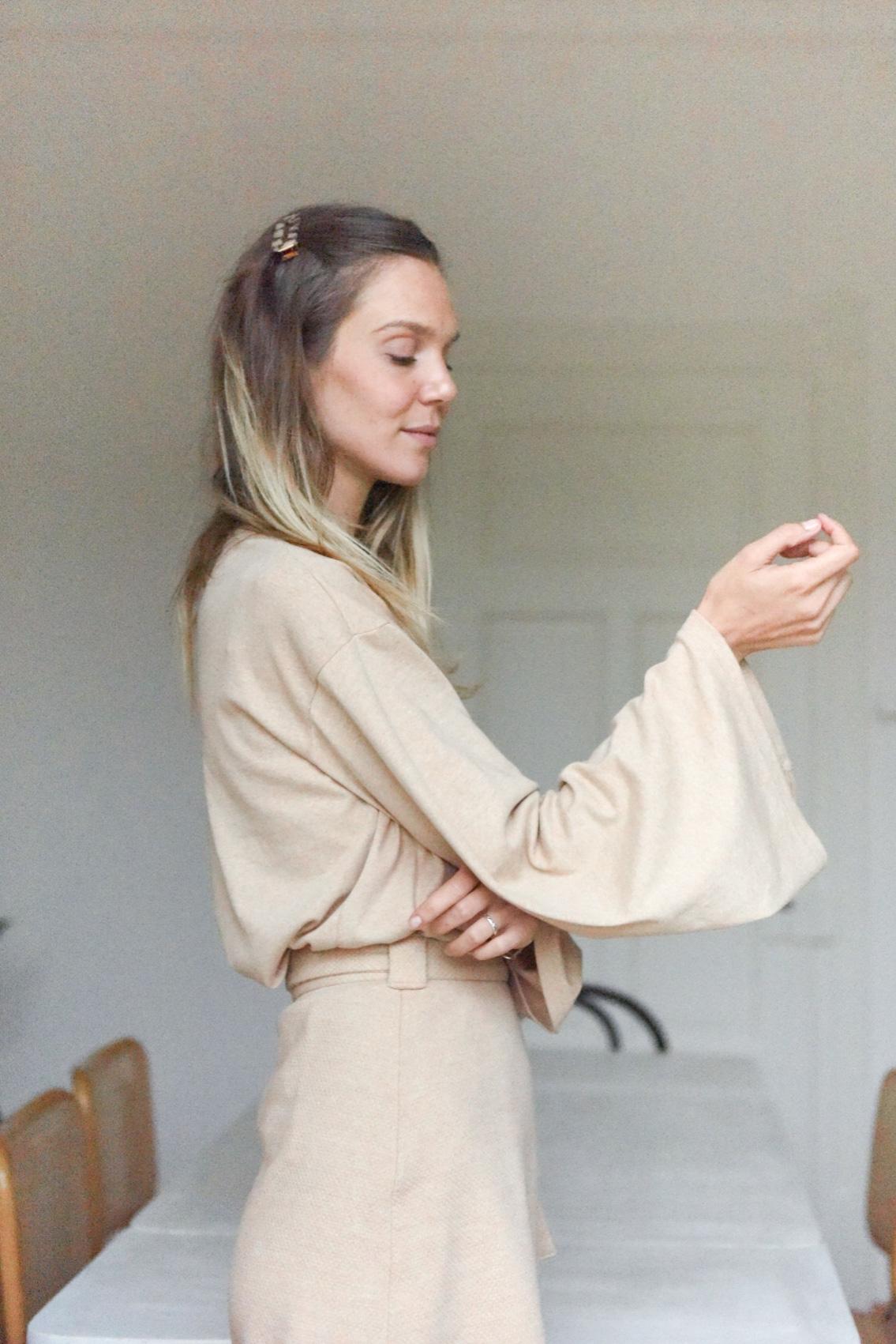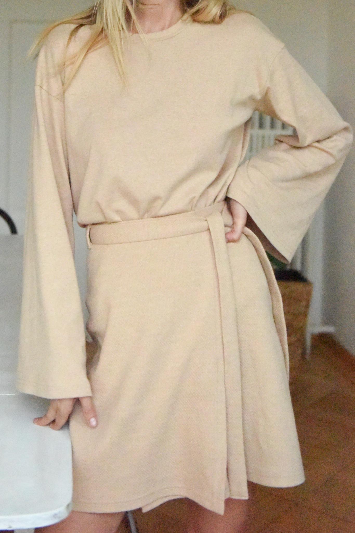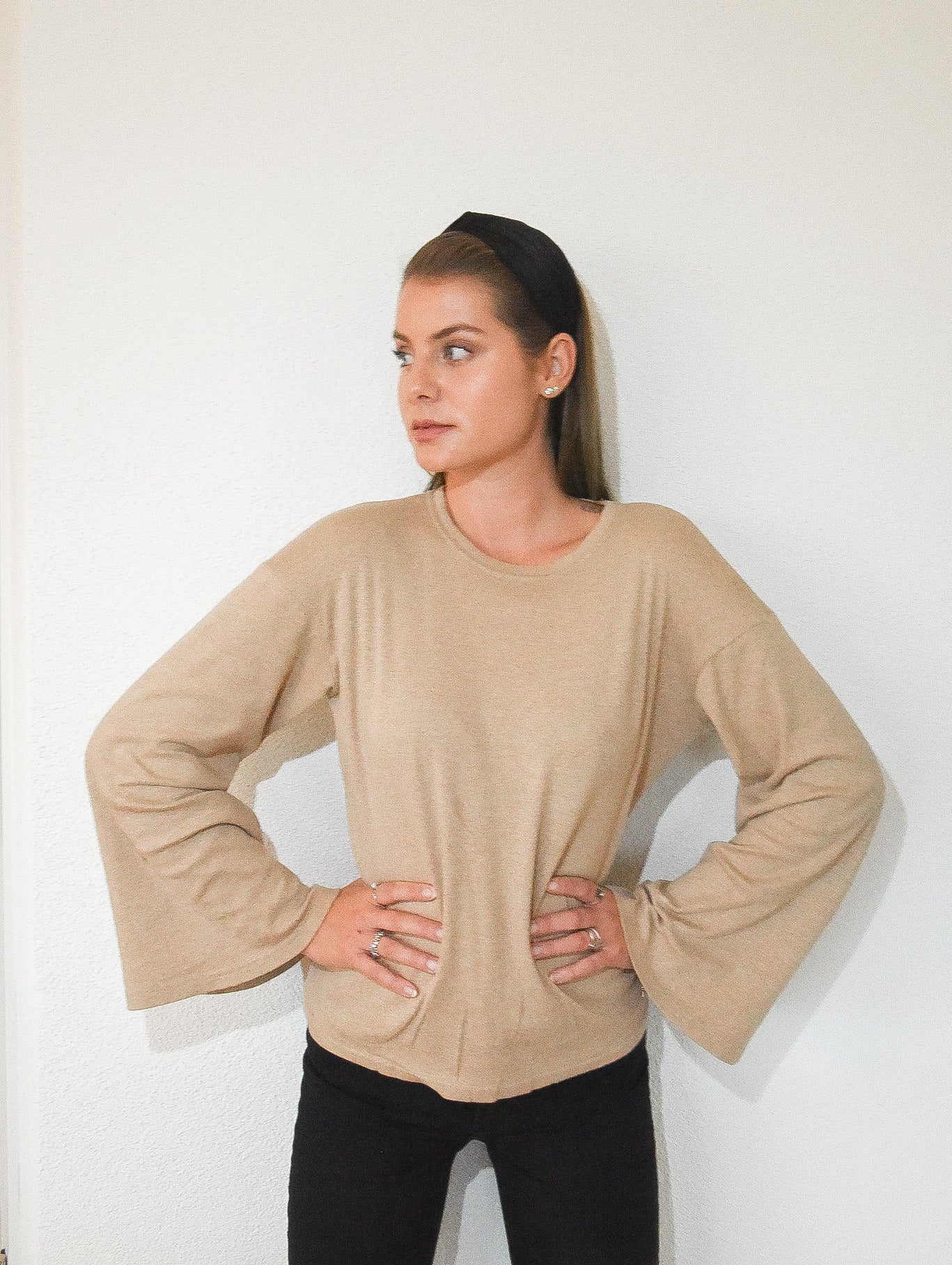 The Mavie Pullover has trumpet sleeves and a loose fit. It is playful yet elegant and matches perfectly with our Merle Wrap-Skirt, any other skirt or with your favorite jeans.