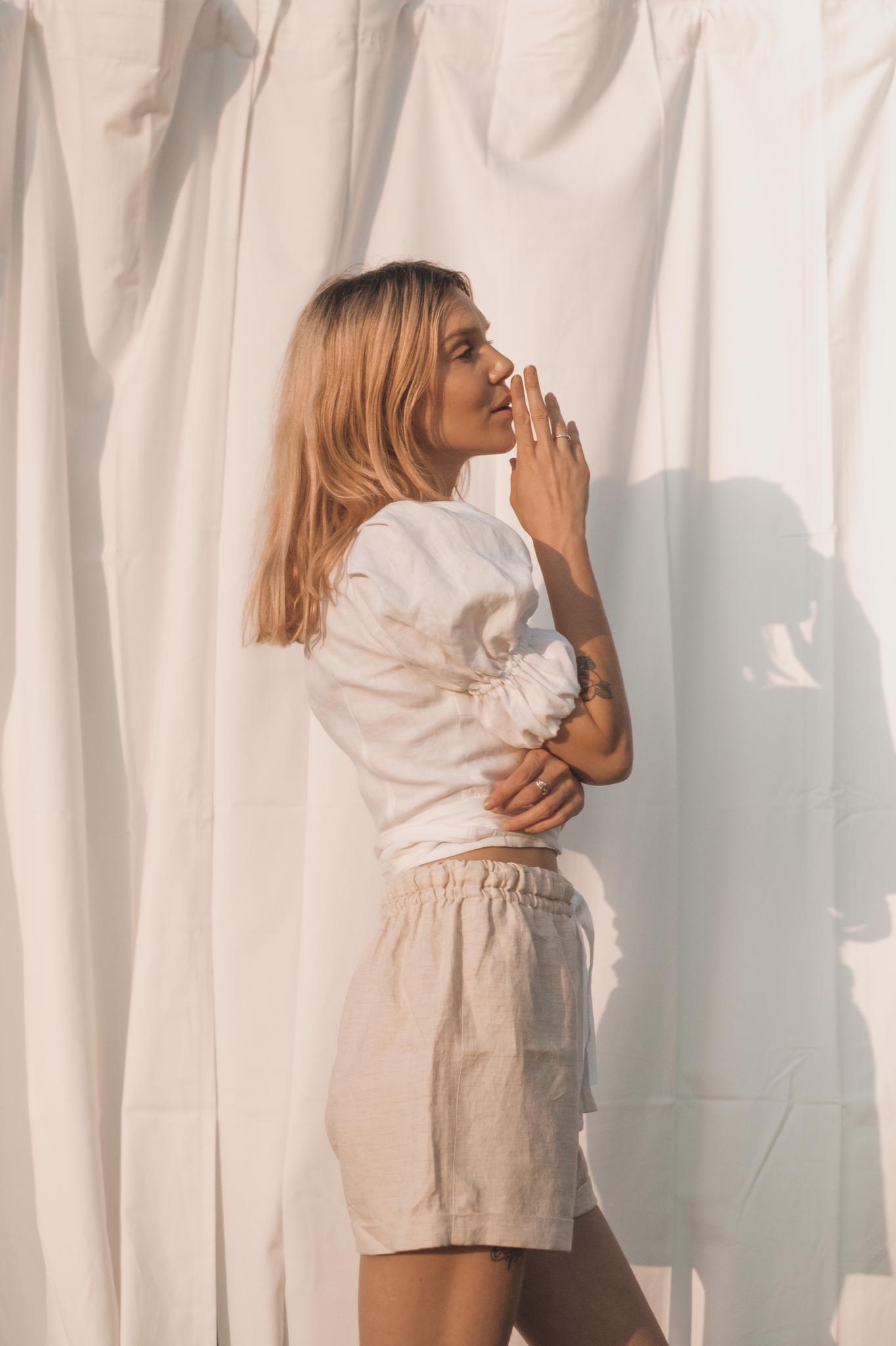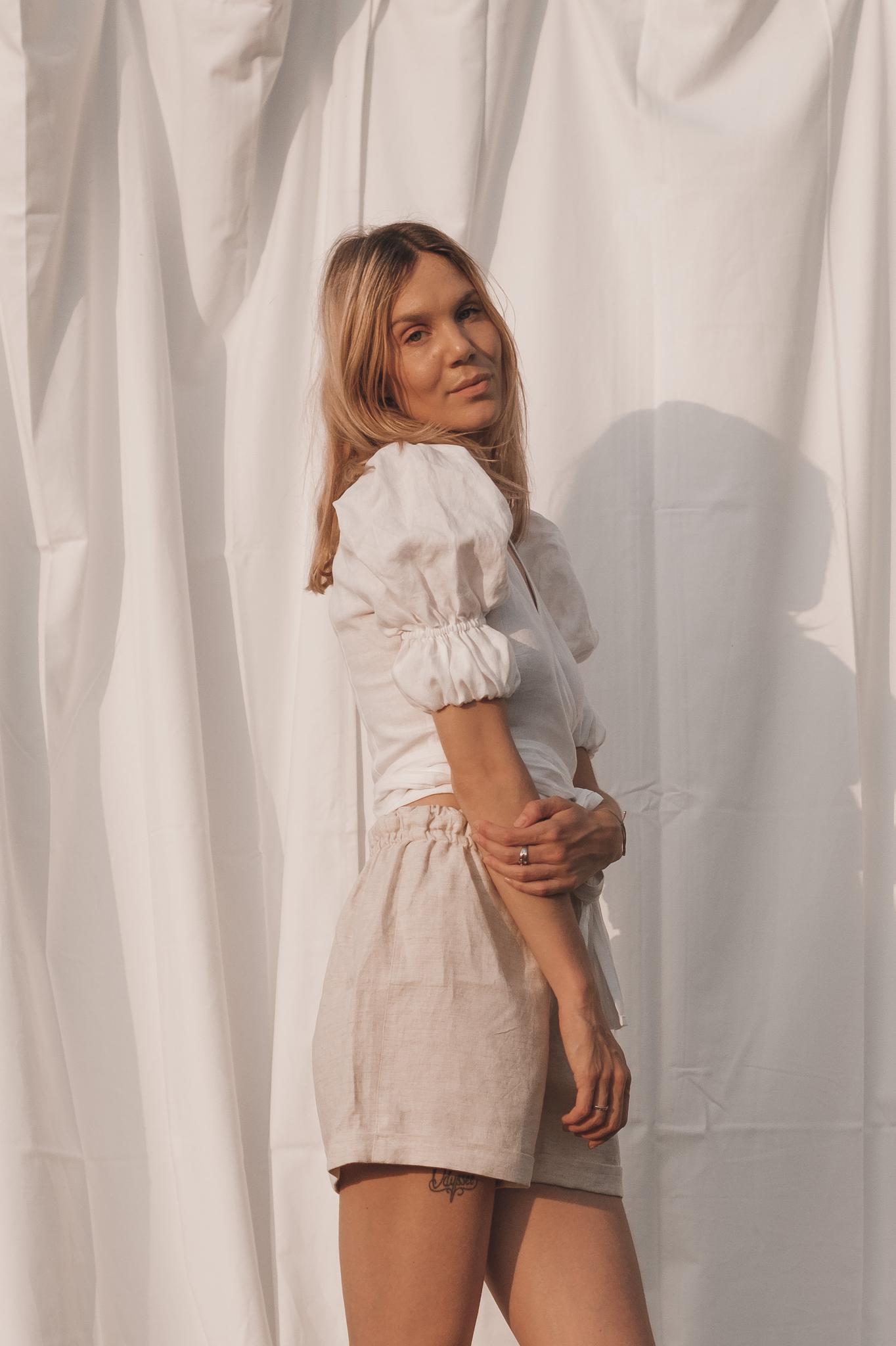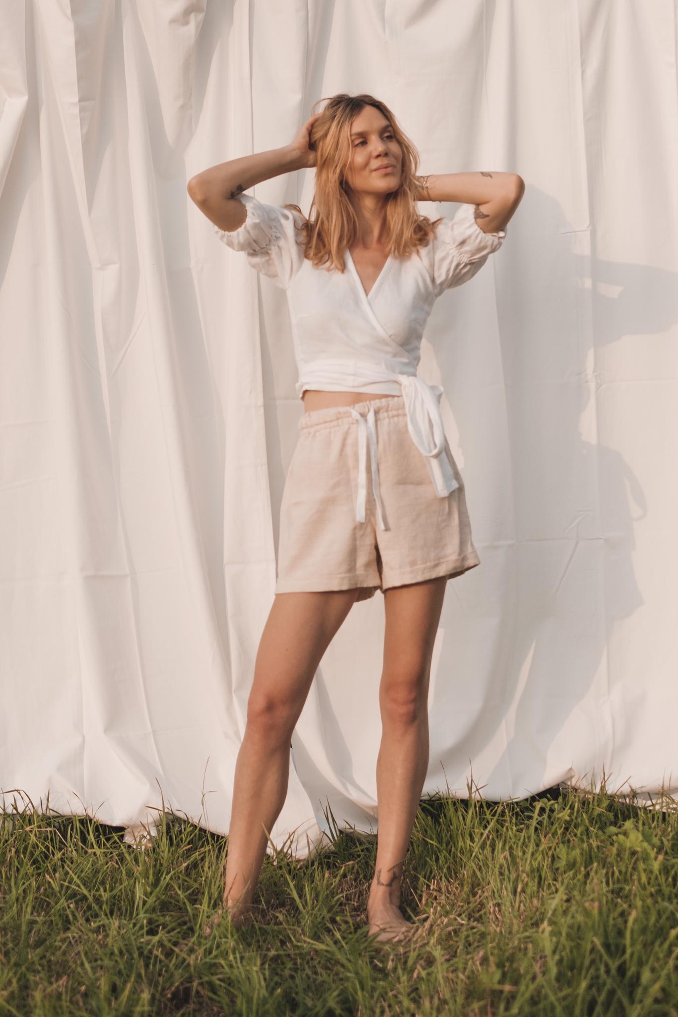Who loves puffy sleeves? The Sarah Wrap Blouse is playful yet elegant and matches perfectly with our pants or with your favorite jeans. This piece is available in white linen or the sand colored hemp-linen mix.