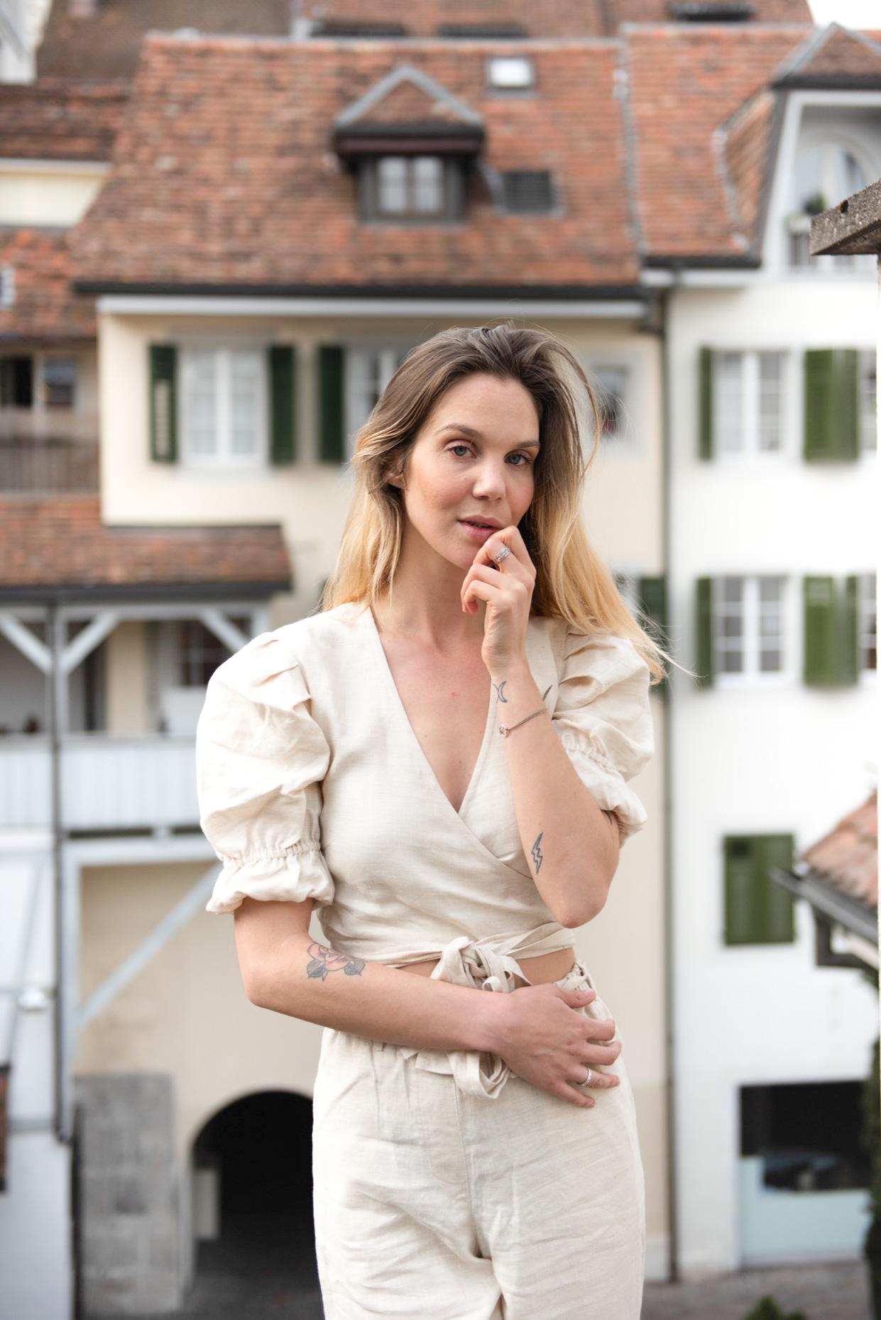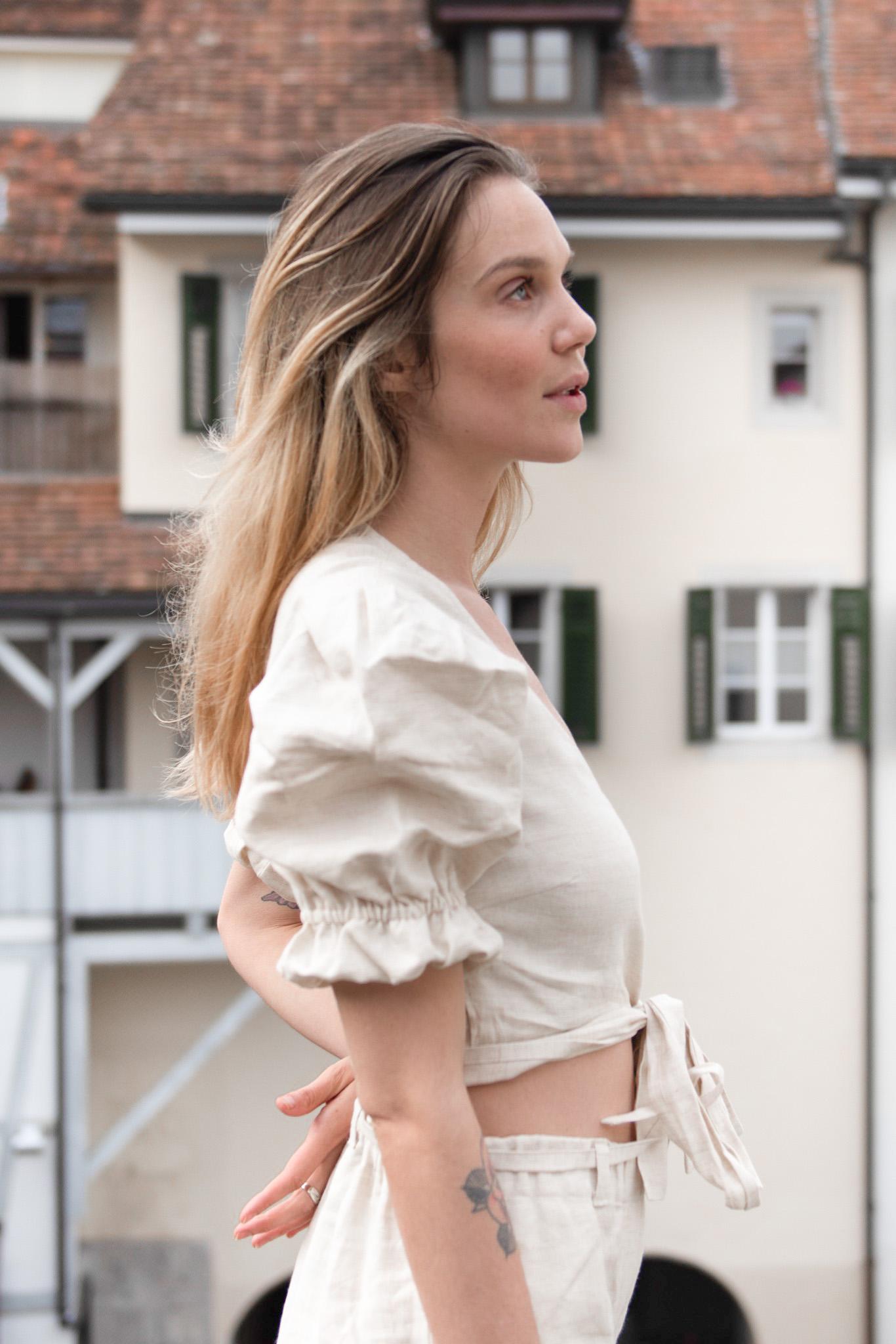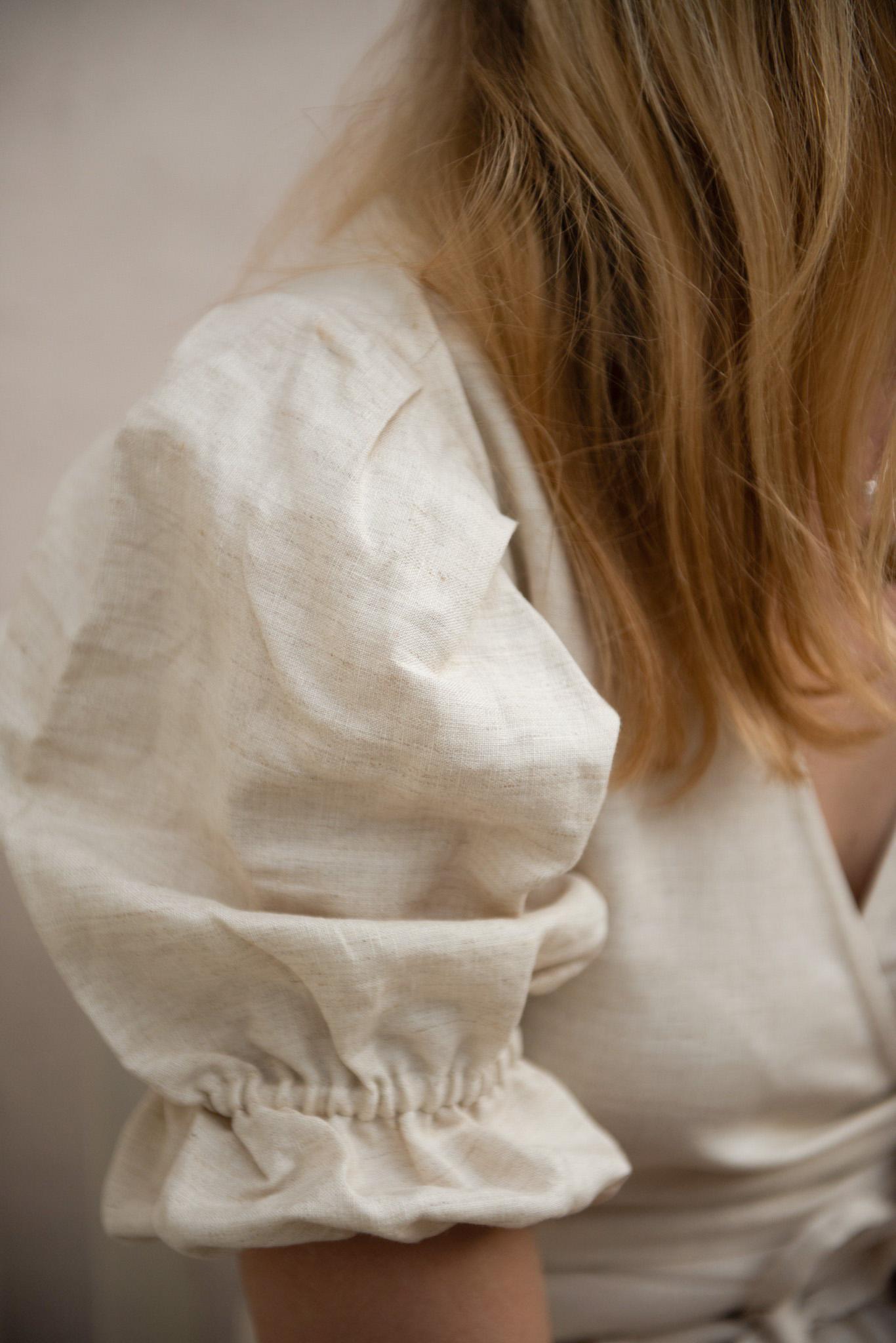 Who loves puffy sleeves? The Sarah Wrap Blouse is playful yet elegant and matches perfectly with our pants or with your favorite jeans. This piece is available in white linen or the sand colored hemp-linen mix.